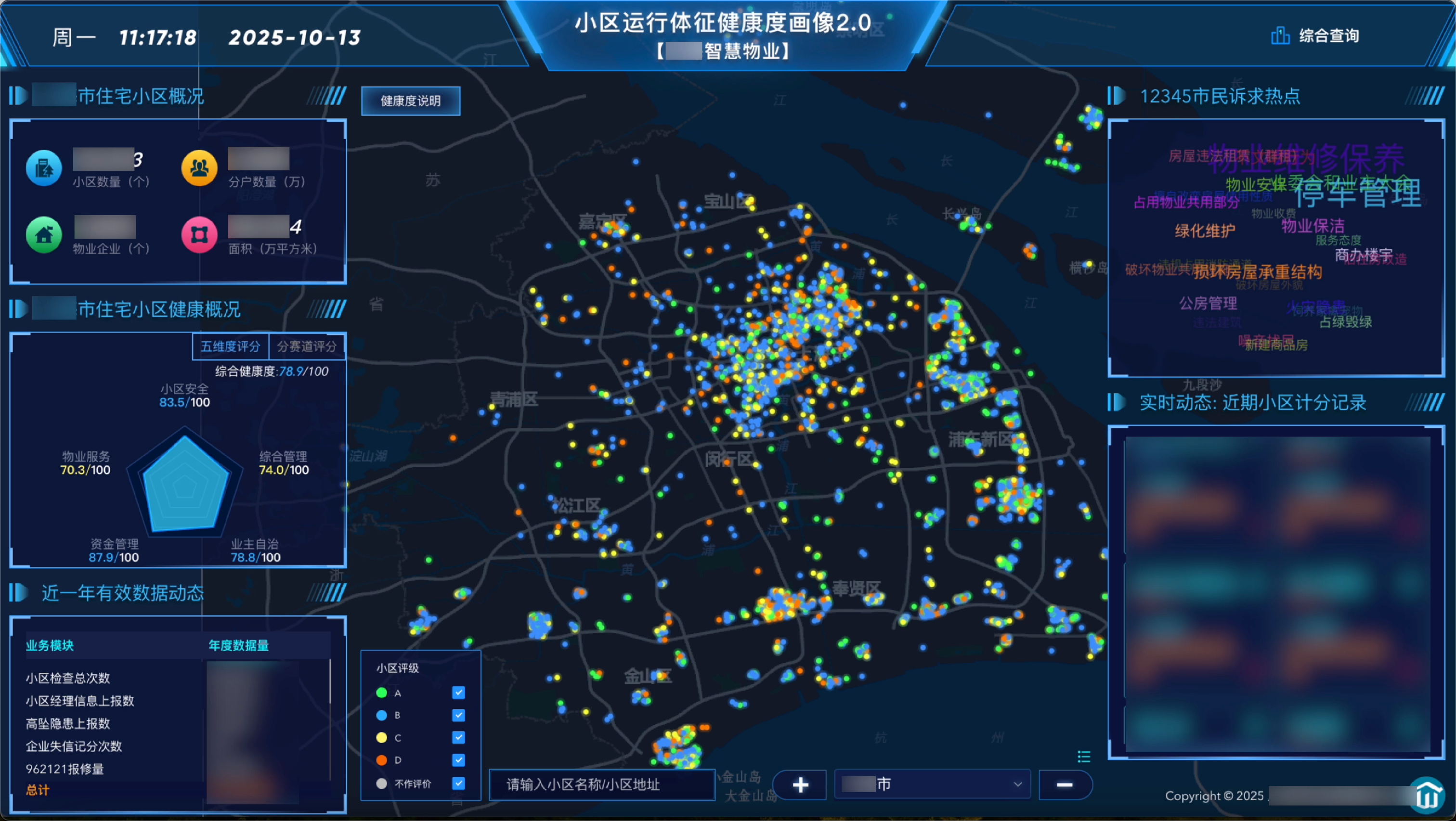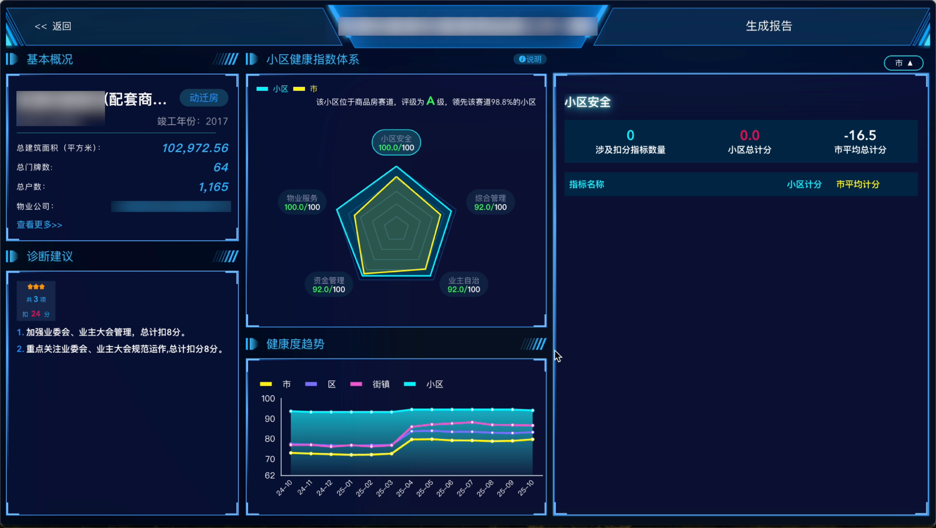 二、智慧类:打造物业监管的“最强大脑”, 包括智慧物业大脑、“小区健康度指示”、红色物业、智慧社区等功能板块。 智慧类产品基于“小区、区级、市级”三位一体的数据循环逻辑,多维度打造监管服务平台,丰富小区监测、安全预警、资金监管等物业场景,实现全区域智慧物业大屏实时监测覆盖,助力中小、超大城市物业精细化管理服务