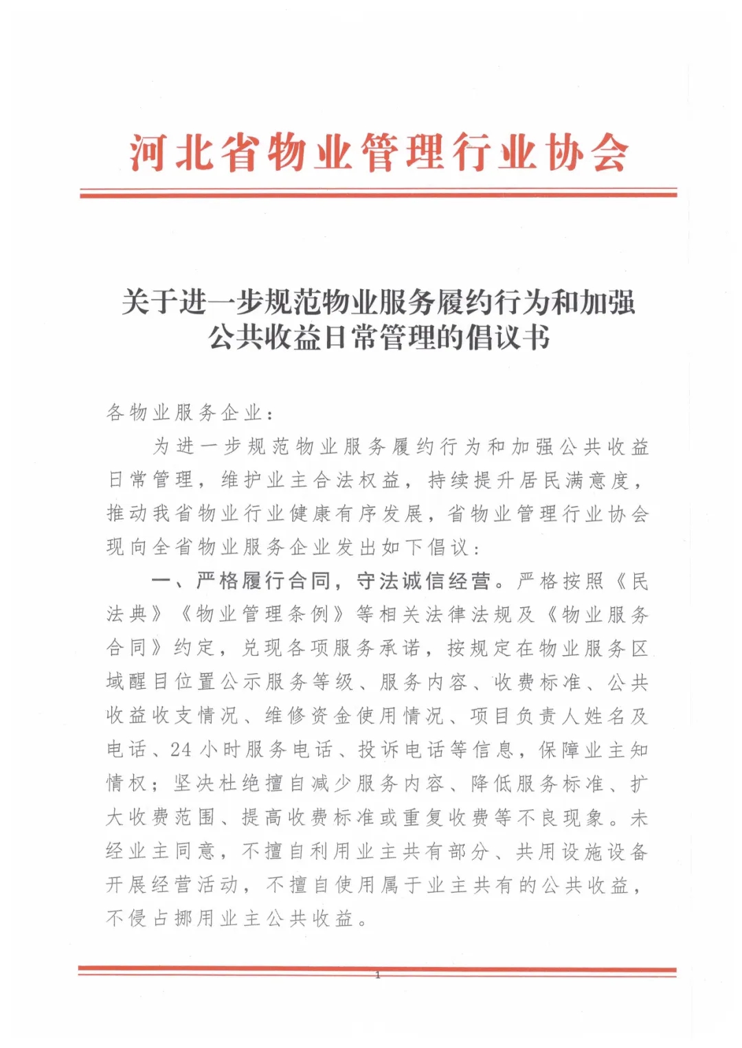 关于进一步规范物业服务履约行为和加强公共收益日常管理的倡议书
