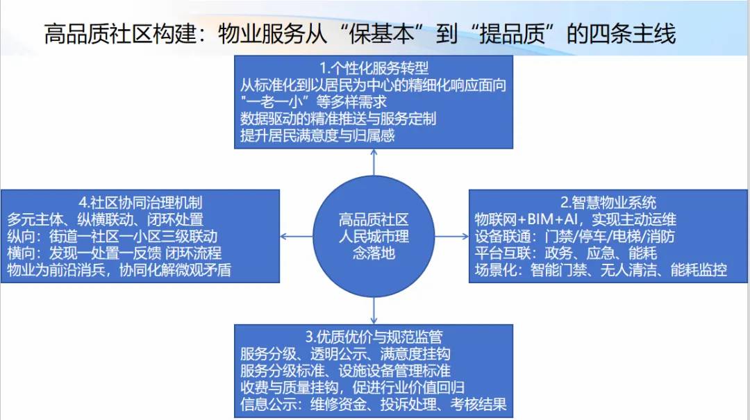 物业服务企业必须深刻把握城市发展进入“存量提质增效”新阶段的核心要求,积极响应中央城市工作会议关于“创造高品质生活空间”“关心呵护‘一老一小’”等重点部署,推动服务模式在保障基础性的“四保”供给的基础上,加快向面向居民多元化、个性化需求的综合性、精细化服务转型。这不仅是满足居民对美好生活不断增长的现实需要,更是将“人民城市理念”从宏观规划落地到社区治理末端的关键抓手。