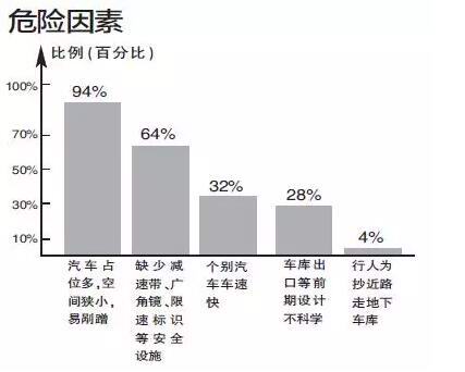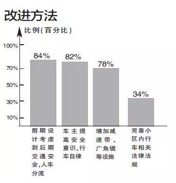面对“小区交通的潜在危险因素有哪些?”47位居民都首先反映“汽车占位多,空间狭小,易剐蹭”,比例占到94%;排在第二位的是“缺乏减速带、广角镜、减速标志等设施”,占到64%;第三位的是“个别汽车车速快”,占32%;第四位的是“车库出口等前期设计不科学”,占28%;“行人为抄近路走地下车库”占4%。结合生活经验,居民给出的建议是,首先“前期设计考虑到后期交通安全,人车分流”,提出这一建议的占到采访人数的84%;第二,“车主提高安全意识,行车自律”,占82%;排在第三的是“增加减速带、广角镜等设施”,占78%;建议“完善小区内行车相关法律法规”的占34%。