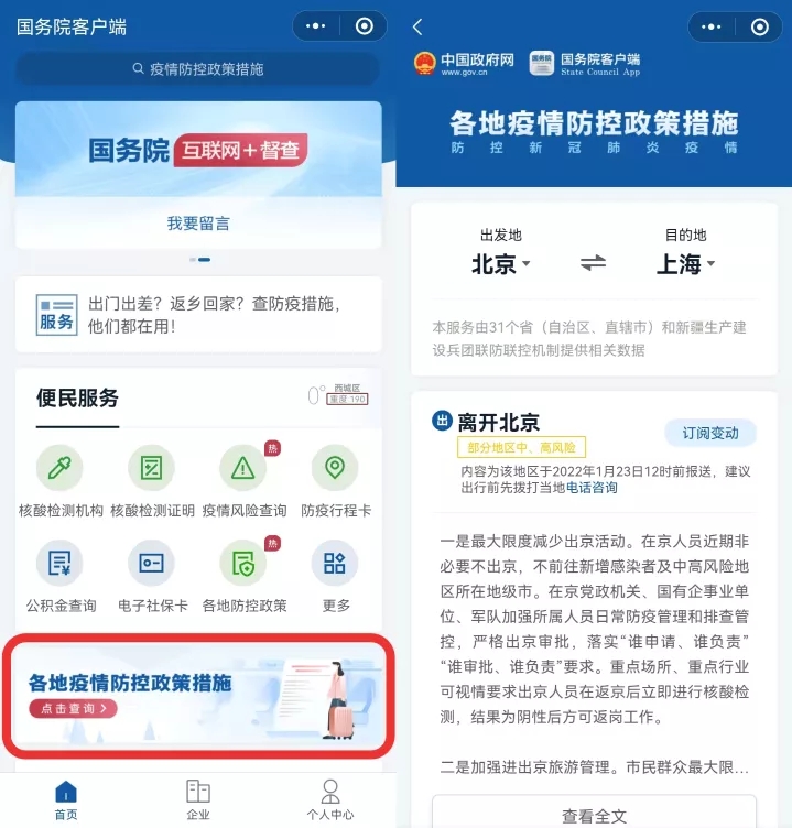 记者在采访中了解到,在国务院客户端微信小程序中设置了各地疫情防控政策查询服务,用户可以选择出发地和目的地,查询各地抵离政策。