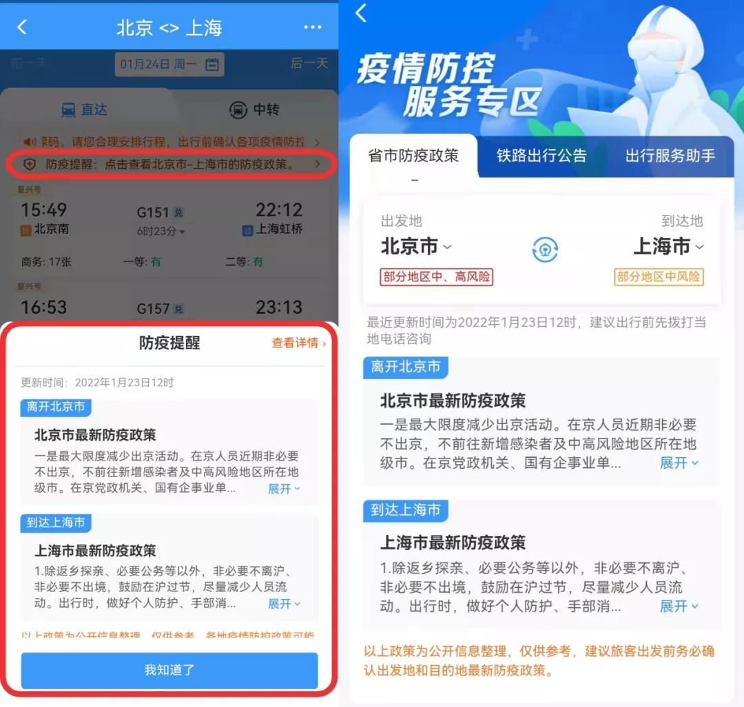 铁路12306手机客户端,购票出发地与到达地疫情防控政策实时查询。(手机截图)
