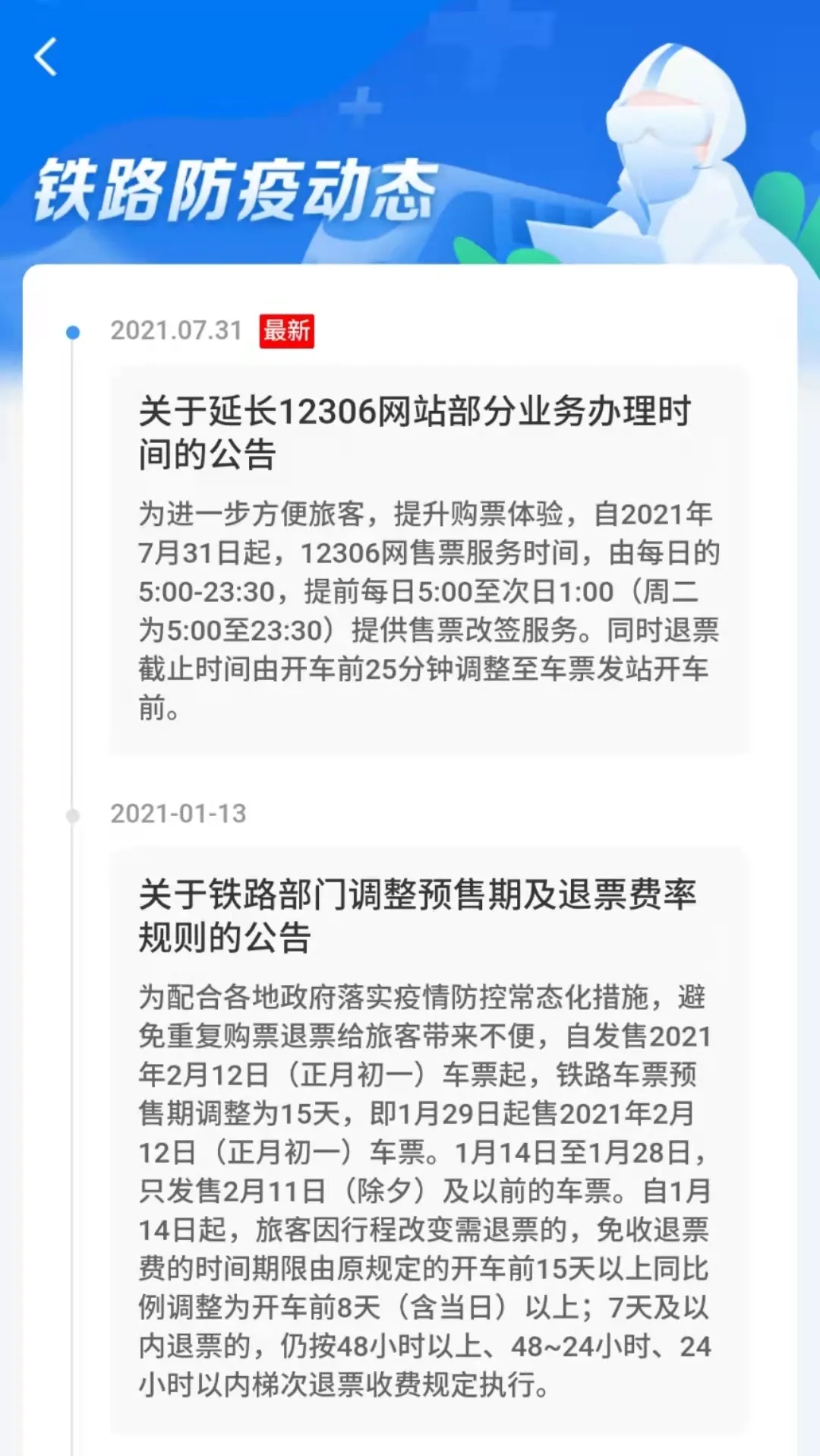 铁路12306手机客户端,铁路防疫动态页面。(手机截图)